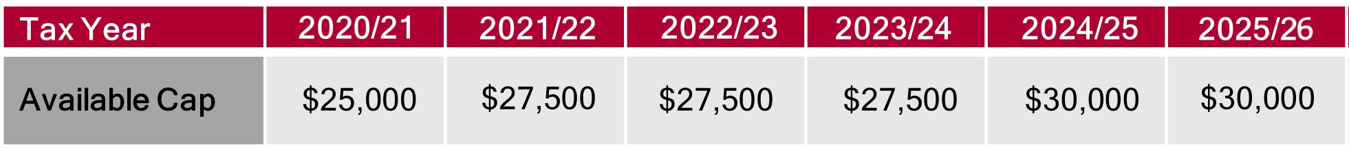 Under current rules, you can opt to “bring forward” two future NCC contribution cap allowances. Effectively allowing you to contribute three tax years at once. You are then unable to make further NCCs until those future years have passed. The current maximum forward contribution in 2025/26 is $360,000.